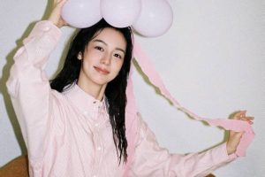 周也穿粉条纹衬衫,戴气球似梦幻少女